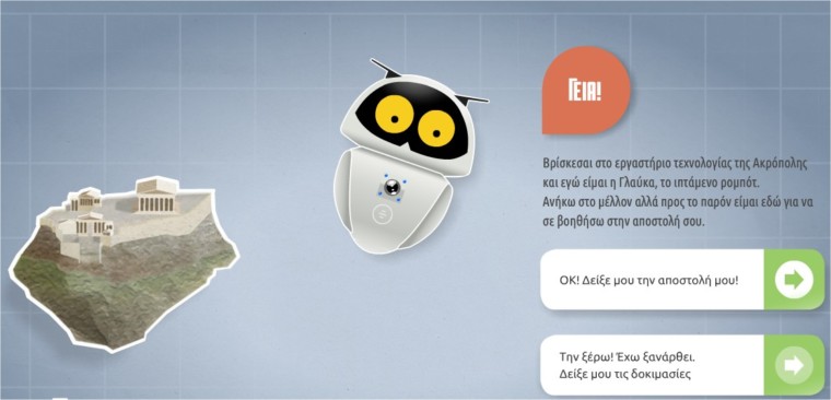 Πρωταγωνιστής είναι η Γλαύκα, ένα ιπτάμενο ρομπότ που καθοδηγεί το παιδί σε όλες τις ενότητες της εφαρμογής. Αποστολή του παιδιού είναι να συμμετάσχει στο πρόγραμμα σχεδιασμού της Γλαύκας και να κερδίσει το βραβείο συμμετοχής του. Αυτό όμως προϋποθέτει την πολύ καλή γνώση της αποκατάστασης των μνημείων της Ακρόπολης, η οποία παρουσιάζεται μέσα από πέντε θεματικές ενότητες:το ταξίδι, τη βοήθεια, το πλήρωμα, τη δράση και το μέλλον.Κάθε ενότητα περιλαμβάνει την προετοιμασία, τη δοκιμασία, το παιχνίδι.