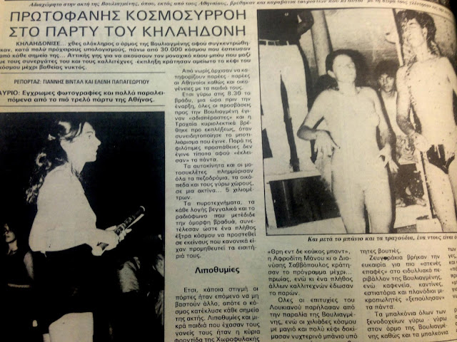 Ο Λυκαβηττός χωράει γύρω στις 3500 χιλιάδες με εισιτήρια, πρέπει να μπήκαν 5.000, 5.500, 6.000, γύρω γύρω, παντού. Εκείνο το βράδυ λοιπόν ήταν η πρώτη μαζική αντιμετώπιση που είχα από τον κόσμο. Για να ευχαριστήσω λοιπόν αυτό τον κόσμο, σκεφτόμουν για το επόμενο καλοκαίρι, να κάνω ένα πάρτυ και να περάσουμε καλά. Σκέφτηκα λοιπόν να το κάνω σ’ ένα δασάκι στο Ψυχικό. Και σκέφτομαι «Τι μαλακίες λες, εκεί δε χωράνε ούτε τριακόσιοι…»