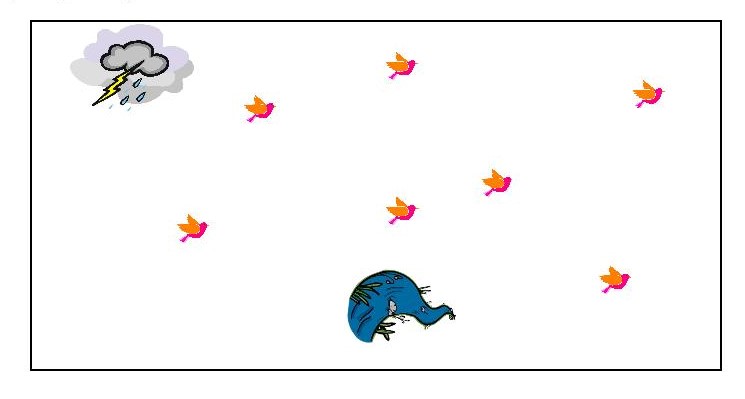 Κατά τη διάρκεια της καταιγίδας τα πουλιά μπορεί να προσπαθήσουν να κρύψουν τα πρόσωπά τους. Η πηγή μπορεί να κάνει πιο έντονες κινήσεις επιτόπου, σαν να φουσκώνει και να ξεχειλίζει από νερό. Μετά την καταιγίδα, τα πουλιά αρχίζουν ένα ένα να πετούν και πάλι (όχι όλα μαζί όπως στην αρχή). Μπορούμε ν’ αποφασίσουμε εμείς ποιος θα κινηθεί πρώτος, ποιος δεύτερος κλπ ή να αναθέσουμε στα παιδιά να ξεκινούν σε μια στιγμή που κανείς άλλος δεν κινείται. Το καταφέρνουν αρκετά εύκολα και μόνα τους.