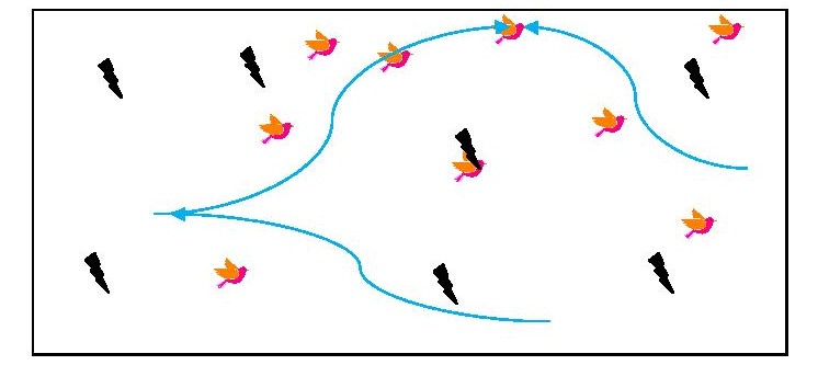 Αν ο χώρος είναι πιο μεγάλος, μπορούμε να τον χρησιμοποιήσουμε όπως φαίνεται παρακάτω: τα πουλιά μπορούν να χορεύουν στο κέντρο κ να σταματήσουν σ’ ένα τυχαίο σημείο όταν ακούσουν το 2ο ritornello (δε γυρίζουν πίσω στην αρχική τους θέση).